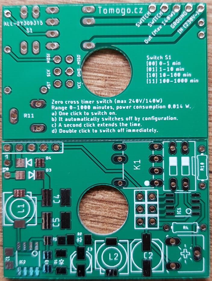 - Nastavitelný rozsah pomocí přepínačů 0-1, 1-10, 10-100, 100-1000 minut (Tady je trochu změna oproti původnímu časovači. Nicméně mi to takto přišlo logické).